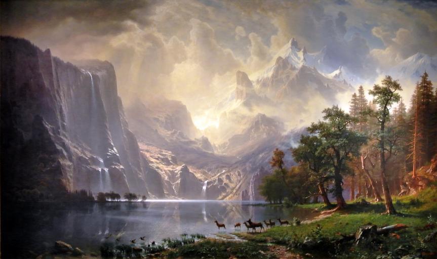 | Keywords: Among the Sierra Nevada Mountains (Bierstadt).jpg Among the Sierra Nevada Mountains California Oil on canvas cm 183 305 Washington D C Smithsonian American Art Museum 2nd Floor East Wing http //americanart si edu/collections/search/artwork/ id 2059 Smithsonian American Art Museum object history credit line Smithsonian American Art Museum Bequest of Helen Huntington Hull granddaughter of William Brown Dinsmore who acquired the painting in 1873 for The Locusts the family estate in Dutchess County New York accession number 1977 107 1 photo by James Steakley 1868 Creator Albert Bierstadt PD-old-100 Other versions 38 53 51 83 N 77 1 20 38 W scale 391_region US Among the Sierra Nevada Mountains by Albert Bierstadt |
