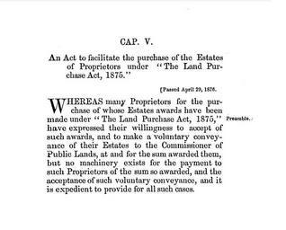 Keywords: An Act to facilitate the purchase of the Estates of Proprietors under the Land Purchase Act, 1875 (title and preamble).jpg Land Purchase Act 39th Victoria Cap 5 was a statute in Prince Edward Island Canada passed by the General Assembly of Prince Edward Island in 1876 to address the problem of absentee landowners http //books google ca/books id RkIQAAAAYAAJ pg PA59 lpg PA59 dq 22Land+Purchase+Act 22+1875+prince+edward source bl ots Ivrm17b7Ik sig I5JoYq5ec4vGDsgW3ARMrEocoFk hl en ei eCajToaIGOTF0AHJ5YjZBA sa X oi book_result ct result resnum 1 ved 0CBwQ6AEwADgK v onepage q 22Land 20Purchase 20Act 22 201875 20prince 20edward f false The acts of the General Assembly of Prince Edward Island 1876 General Assembly of Prince Edward Island 1876-04-29 PD-Old Statutes of Canada 1876 in Prince Edward Island 1876 documents