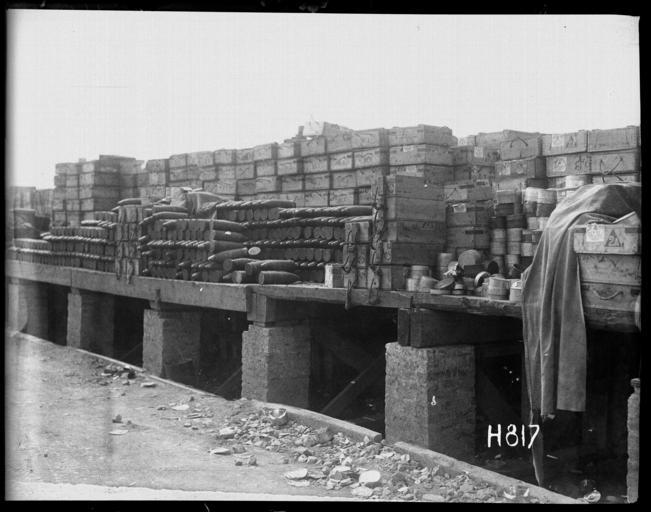 Keywords: blackandwhite monochrome photo border outdoor black and white A general view of an ammunition store in World War I. Boxes of ammunition are piled on a raised wooden platform. Various shells are also stacked at the front. Photograph taken 1917 by Henry Armytage Sanders. Inscriptions: Inscribed - Photographer's title on negative -bottom right: H817. Quantity: 1 b&w original negative(s). Physical Description: Dry plate glass negative 4 x 5 inches An ammunition dump, World War I. Royal New Zealand Returned and Services' Association :New Zealand official negatives, World War 1914-1918. Ref: 1/2-013401-G. Alexander Turnbull Library, Wellington, New Zealand. natlib.govt.nz/records/22637868 A general view of an ammunition store in World War I. Boxes of ammunition are piled on a raised wooden platform. Various shells are also stacked at the front. Photograph taken 1917 by Henry Armytage Sanders. Inscriptions: Inscribed - Photographer's title on negative -bottom right: H817. Quantity: 1 b&w original negative(s). Physical Description: Dry plate glass negative 4 x 5 inches An ammunition dump, World War I. Royal New Zealand Returned and Services' Association :New Zealand official negatives, World War 1914-1918. Ref: 1/2-013401-G. Alexander Turnbull Library, Wellington, New Zealand. natlib.govt.nz/records/22637868 |