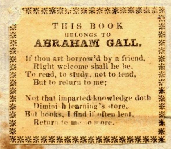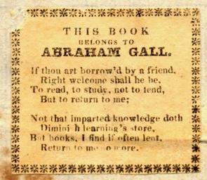 Keywords: An ex libris poem(1741).jpg left If thou art borrow'd by a friend <br /> Right welcome shall he be <br /> To read to study not to lend <br /> But to return to me;<br /> <br /> Not that imparted knowledge doth<br /> Diminish learning's store <br /> But books I find if often lent <br /> Return to me no more אקס יבריס ע הודעה בחרוזי הקוראת מוצא הישר החזיר את הספר בע יו A new method of chemistry including the history theory and practice of the art / translated from the original Latin of Dr Boerhaave s Elementa chemiae as published by himself by Peter Shaw London T Longman 1741 upload by the http //www facebook com/NationalLibraryofIsrael National Library of Israel facebook page http //www facebook com/photo php fbid 208732815808617 set a 208732795808619 61952 140556749292891 theater http //a6 sphotos ak fbcdn net/hphotos-ak-snc6/200059_208732815808617_140556749292891_889714_4920835_n jpg dl 1 Download Abraham Gall 1741 PD-old-100 Ex libris Ex-libris of the United Kingdom |