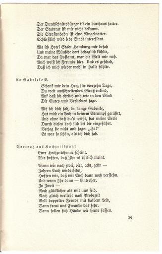 Keywords: An Gabriele B Ringelnatz.jpg žAn Gabriele B aus žDer Nachlaß von Joachim Ringelnatz Berlin 1935 Rowohlt Verlag S 39 Scan aus dem Original-Buch / Scan from the original book 1935 Creator Joachim Ringelnatz Copyright abgelaufen da der Autor vor über 70 Jahren verstarb / Copyright expired as author died more than 70 years ago PD-old Joachim Ringelnatz |