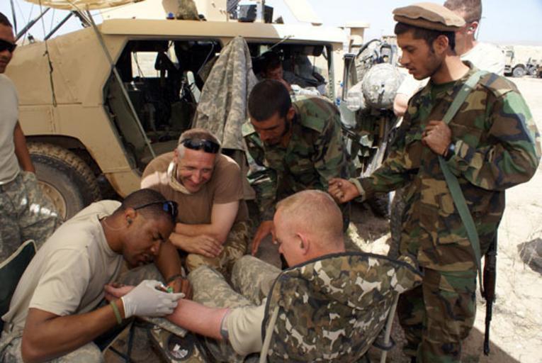 Keywords: ANA continues to train, lead with support of Soldiers DVIDS45897.jpg en Medics with the Afghan National Army look on as Army Maj Marc Daniels operations officer with the 3rd Brigade 205th Regional Security Assistance Command Logistics Support Team administers a field IV to prevent a heat casualty at Forward Operating Base Robinson in Helmand Province April 9 1999-11-30 Sgt Leeann Lloyd https //www dvidshub net/image/45897 45897 2007-06-04 11 52 HELMAND PROVINCE AF PD-USGov Helmand Province in the War in Afghanistan 2001-present Images from DoD uploaded by Fæ |