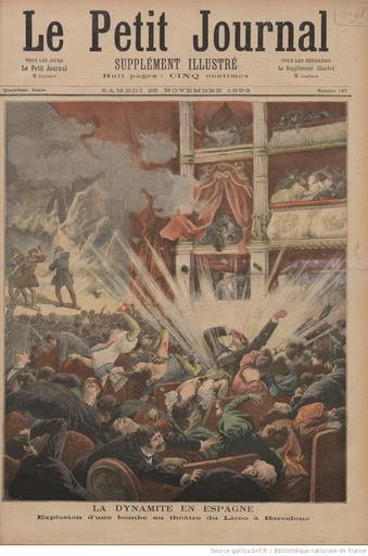 | Keywords: Anarchist bomb Barcelona 1893.jpg en Artist's depiction of the detonation of two bombs in the orchestra pit of the Liceu Theater in Barcelona in November of 1893 2011-10-17 Le Petit Journal 1893 author PD-old-100 PD-Art Uploaded with UploadWizard Anarchism |