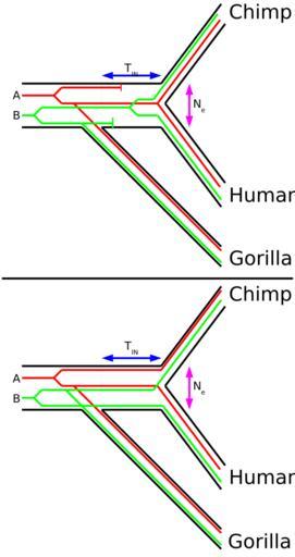 | Keywords: Ancestralsizehuman.svg  When three species are fairly closely related to each other like human chimpanzee and gorilla the trees obtained from DNA sequence data may not be congruent with the tree that represents the speciation species tree A and B are two different loci In the upper figure they fit to the species tree the DNA that is present in todays gorillas diverged earlier from the DNA that is present in todays human and chimp Thus both loci should be more similar between human and chimp than between gorilla and chimp or gorilla and human The lower graph is different locus A in human and gorilla have a more recent common ancestor compared to the chimpanzee sequence Whereas chimp and gorillas have a more recent common ancestor for locus B which is therefore more similar in sequence between the two The gene trees do not fit to the species tree The shorter internodal time span T<sub>IN</sub> the more common are incongruent gene trees The effective population size N<sub>e</sub> of the internodal population determines how long genetic lineages are preserved in the population A higher effective population size causes more incongruent gene trees Therefore if the internodal time span is known the ancestral effective population size of the common ancestor of humans and chimpanzees can be calculated Chen Li 2001 Chen F C Li W H 2001 'Genomic divergences between humans and other hominoids and the effective population size of the common ancestor of humans and chimpanzees ' Am J Hum Genet 68 2 444--456 http //www pubmedcentral nih gov/articlerender fcgi tool pubmed pubmedid 11170892 Own 2006-08-28 Molgen US Public Domain or free content licenses phylogenetic trees of humans |