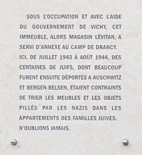 | Keywords: Anciens magasins Levitan (plaque).jpg en Plaque sur les anciens magasins de meubles Levitan 85-87 rue du faubourg Saint-Martin Paris 10th arrond The text is <br> During the German occupation of Paris and with the help of the French government of Vichy this building at that time furniture shop Levitan was an annex of the deportation camp of Drancy Here from july 1943 to august 1944 hundred of jewish people whose many were afterwards deported to the camps of Auschwitz and Bergen-Belsen were obliged to sort the furniture and the objects stolen by nazis in the flats of the jewish families Never forget fr Plaque sur les anciens magasins de meubles Levitan 85-87 rue du faubourg Saint-Martin Paris 10 e arr own Tangopaso 2011-04-29 thumb left Overview of the building 48 52 22 09 N 2 21 27 72 E region FR_heading WNW Magasins Lévitan Plaques in Paris 10e arrondissement Plaques referencing 1943 Plaques referencing 1944 in France Antisemitism in France German occupation in Paris |