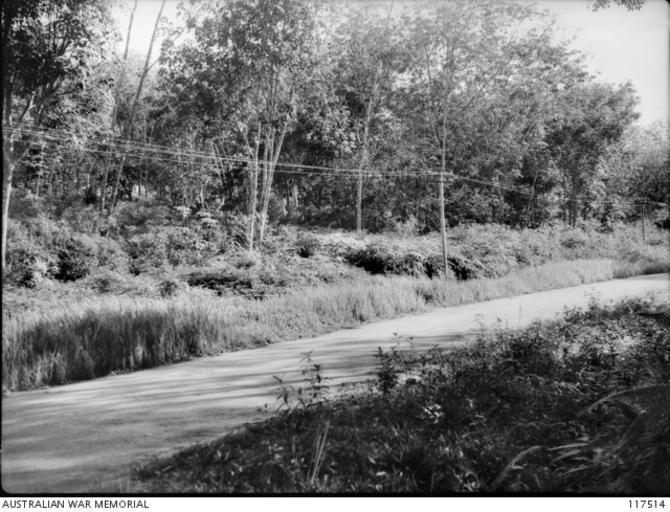 Keywords: Anderson bayonet charge.jpg en MUAR AREA JOHORE MALAYA 1945-09-26 THE APPROXIMATE POSITION WHERE LIEUTENANT COLONEL C G W ANDERSON VC MC LED THE BAYONET CHARGE AGAINST THE JAPANESE MACHINE GUN POSITION DURING THE BATTLE FOR THE MUAR ROAD 117514 Australian War Memorial 1945-09-26 PD-Australia Battle of Muar Black and white photographs