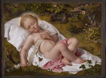 | Keywords: Andreas Johann Jacob Müller - The Christ Child - Walters 37178.jpg  The sleeping child lies on a sheet of white cloth partially covered by a pink cloth He is identified by the aureole of light and three stylized rays forming a halo and by the ribbon he holds which is inscribed AGN US DEI ECCE QUI TOLLIS PECCATA MUNDI MISERERE NOBIS Roman Missal Communion 3 He is surrounded by meticulously rendered flora and fauna laden with Christian symbolism The rose bushes allude to martyrdom strawberry plants to perfect righteousness violets to humility several stalks of wheat to the human nature of Christ some daisies to his innocence the butterfly to the Resurrection the goldfinch to the Passion the pair of turtle doves to purity and the swallow to the Incarnation This painting replicates a section of an unlocated picture the Virgin and Saint John accompanied by three angels adoring the Christ Child which was reproduced as a steel engraving by Wm Ridgway in a Bible published by James S Virtue London n d 1849 oil on panel cm 11 6 15 5 accession number 37 178 25563 William T / Henry Walters Collection Baltimore date and mode of acquisition unknown Walters Art Museum Henry Walters Acquired by William T or Henry Walters Inscription On back of panel A Müller pinx 1849 Düsseldorf place of origin Germany Walters Art Museum license 2D Andreas Johann Jacob Müller Paintings in the Walters Art Museum 19th-century paintings of Jesus Christ as a baby 1849 paintings in the United States 19th-century oil on panel paintings in the United States 19th-century religious paintings in the United States Birds in art Paintings of Jesus Christ as a sleeping child Strawberries in art |