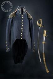 Keywords: price of freedom priceoffreedom military history militaryhistory uniforms smithsonian probably public domain probablypublicdomain indoor SI Neg. 2004-40493. Date: na....Blue wool frock coat, gold colored buttons on jacket front and sleves. Gold trim at neck and cuffs with epaulets. Epaulets are boullioun and gold lace with cloth strap and gold lace, mounted on board..Andrew Jackson's uniform coat he wore at the Battle of New Orleans..Forged steel with metal scabbard..Andrew Jackson carried this sword and scabbard while commanding during the Creek War in the War of 1812...Credit: Harold Dorwin (Smithsonian Institution) SI Neg. 2004-40493. Date: na....Blue wool frock coat, gold colored buttons on jacket front and sleves. Gold trim at neck and cuffs with epaulets. Epaulets are boullioun and gold lace with cloth strap and gold lace, mounted on board..Andrew Jackson's uniform coat he wore at the Battle of New Orleans..Forged steel with metal scabbard..Andrew Jackson carried this sword and scabbard while commanding during the Creek War in the War of 1812...Credit: Harold Dorwin (Smithsonian Institution)