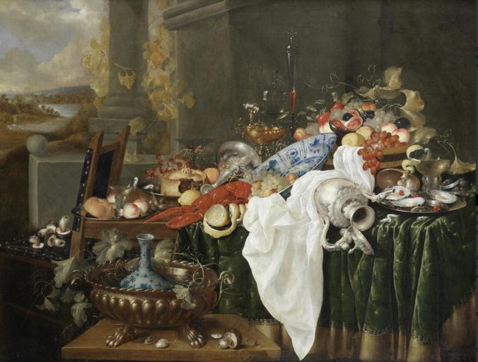 | Keywords: Andries de Coninck - A still life of a pie on a silver dish.jpg Artwork creator Andries de Coninck en A still life of a pie on a silver dish a lobster a silver cup and ewer a wan-li kraak bowl numerous fruits oysters and glasses of wine with white and green cloths on a table beside a gilt bowl with a blue and white vase and boletes on a chair with a view to a river landscape beyond Oil canvas cm 123 170 1643-1659 https //www bonhams com/auctions/20016/lot/37/ signed ' A DE Coninck fe ' on table lower left At Bonhams London 4 July 2012 lot 37 PD-old-100 Other versions Andries de Coninck 17th-century paintings of Vanitas 17th-century oil on canvas paintings 1650s still life paintings 17th-century still life paintings of food Oil still-life paintings Still-life paintings with oysters Paintings of lobsters |