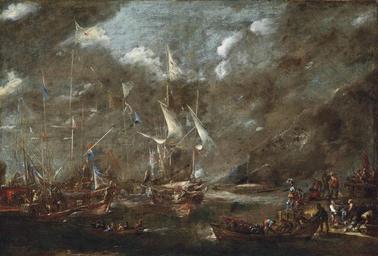 | Keywords: Andries van Eertvelt - The Holy League's fleet lying off a harbour, thought to be Genoa, before the battle of Lepanto.jpg Artwork Creator Andries van Eertvelt The Holy League's fleet lying off a harbour thought to be Genoa before the battle of Lepanto with figures loading arms and armour onto a boat in the foreground with a dignitary looking on Oil on canvas cm 95 3 139 7 http //www mutualart com/Artwork/The-Holy-League-s-fleet-lying-off-a-harb/AD3A1917261C4389 /69643A353737382C73656C65637465643A74727565 mutualart com object history credit line accession number Christie's online 5835026 5786 4 Amsterdam 12 November 2014 page no more available PD-old-100 DEFAULTSORT Eertvelt Andries van; Battle of Lepanto; Christie's 2014 Marine paintings by Andries van Eertvelt Baroque paintings of ships Paintings of Battle of Lepanto Oil paintings of watercraft 17th-century sailing ships in paintings |