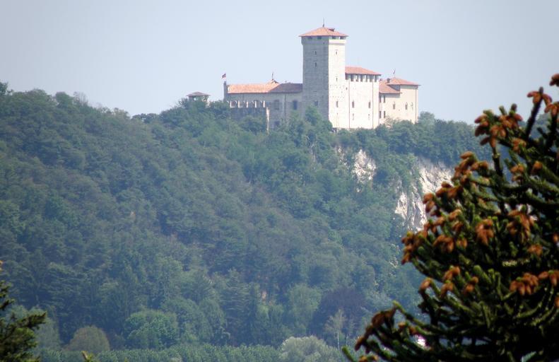 Keywords: Angera Rocca 30.JPG fr Forteresse d'Angera en italien Rocca di Angera juchée sur son éperon rocheux surplombant la localité italienne d'Angera dans la province de Varèse sur la rive orientale lombarde du lac Majeur Flancs nord à gauche et occidental à droite du château Vue prise au téléobjectif depuis le village de Meina sur la rive opposée piémontaise du lac Majeur à plus de 3km de distance à vol d'oiseau de la forteresse d'où la médiocre qualité de l'image et les contours ondoyants du bâtiment Nous regardons vers le sud-est 2012-07-08 own Torsade de Pointes cc-zero Uploaded with UploadWizard Rocca di Angera |