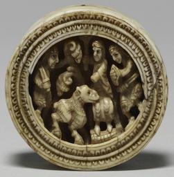 | Keywords: Anglo-Norman - Game Piece with Enthroned Figure - Walters 71141.jpg On this richly carved game piece two soldiers shown with swords and shields present a sheep to an enthroned figure with a scepter in his hands The dark stone inlay used for the figures' eyes and the deep fine carving indicate costly workmanship The upper portion of the border is a modern restoration ca 1150 Medieval walrus ivory jet inlay cm 5 45 1 55 accession number 71 141 34963 Sigismund Bardac Paris date and mode of acquisition unknown Julius Boehler Munich date and mode of acquisition unknown Kaiser Friedrich Museum Berlin date and mode of acquisition unknown Henry Walters city Baltimore Walters Art Museum Henry Walters Acquired by Henry Walters 1926 Checkmate Medieval People at Play The Walters Art Museum Baltimore 2010 place of origin north France Walters Art Museum license Medieval ivory in the Walters Art Museum Round sculpted ivory items Gaming pieces Sculptures of sheep Sculptures of soldiers 12th-century sculptures Anglo-Normans |