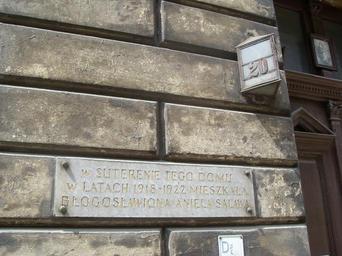 Keywords: Aniela Salawa.JPG pl Tablica na budynku przy ul Radziwiłłowskiej 20 w Krakowie w którym w latach 1918 - 1922 mieszkała bł Aniela Salawa own Miezian 2009-06 Radziwiłłowskiej Street in Kraków Here-lived plaques in Kraków Aniela Salawa