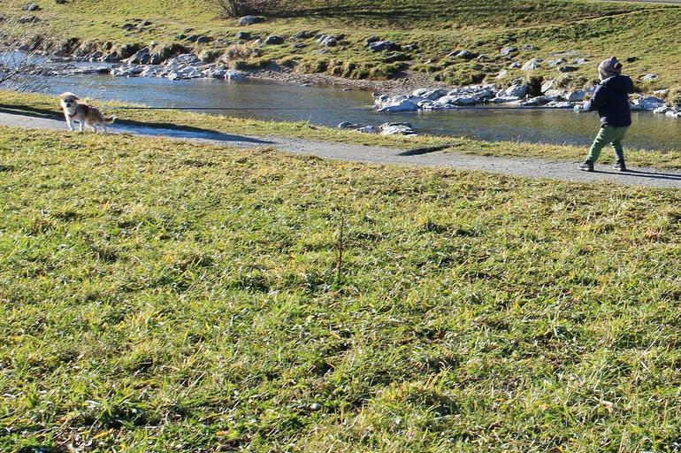 Keywords: animal dog play go walkies meadow go leash long leash water river bach human child