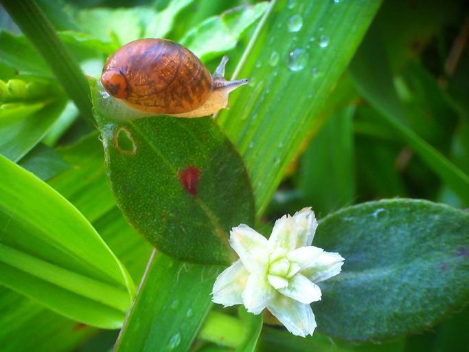 Keywords: animals flowers dew snail green morning leaf plant