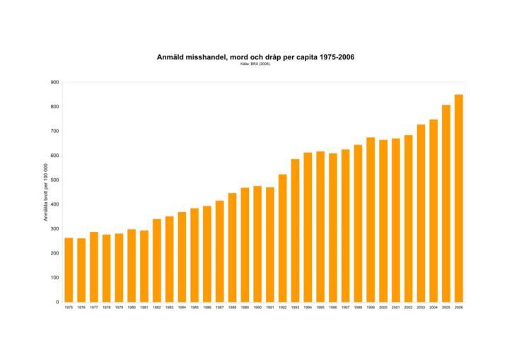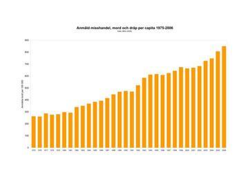 Keywords: Anmäld misshandel 1975-2006.svg en Reported number of violent including deadly crimes in Sweden per 100 000 pop years 1975-2006 sv Anmäld misshandel dråp och mord i Sverige per 100 000 invånare år 1975-2006 Own Koyos 2009-01-20 Data from BRÅ 2008 Demographics of Sweden Sociological bar charts Violent crime statistics |