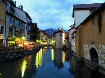 Keywords: annecy channel france water reflection mirroring alley evening night romantic cozy twilight atmosphere