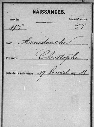 Keywords: Annedouche birth certificate.JPG en Birth Ceritificate Christophe Annedouche 17 Prairial 11 6 June 1803 in 3rd arrondissement of Paris 1803-06-28 16 46 20 http //canadp-archivesenligne paris fr/archives_etat_civil/avant_1860_fichiers_etat_civil_reconstitue/fecr_visu_img php registre V3E_N_0033 type ECRF bdd_en_cours etat_civil_rec_fichiers vue_tranche_debut AD075ER_5MI20708_03810_C vue_tranche_fin AD075ER_5MI20708_03860_C ref_histo 58511 cote V3E/N 2033 here p 2 NA other versions PD-old-70-1923 Christophe Annedouche |