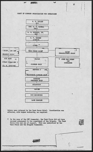 | Keywords: Annex No. 6 Chart of Command Organization for Operations - NARA - 193248.tif  Scope and content Supplemental material used in Maxwell Taylor's report on the Bay of Pigs operation General notes 193248 Local identifier President 1961-1963 Kennedy Office of the Special Assistant to the President for National Security Affairs 01/20/1961 - 11/22/1963 NARA-Place Cuba North and Central America nation 4186389 21 5 -80 <br /> John F Kennedy Library NLJFK Columbia Point Boston MA 02125-3398 ca 04/1961 Record group Collection JFK-NSF Papers of President Kennedy National Security Files 01/20/1961 - 11/22/1963 Record group ARC 1164 Papers of President Kennedy National Security Files Countries compiled 01/20/1961 - 11/22/1963 Series ARC 193236 File unit Papers of President Kennedy National Security Files Countries Cuba Subjects Paramilitary Study Group Taylor Report 04/1961 - 07/1961 File unit ARC 193237 Variant control numbers NAIL Control Number NLK-NSF-CNTRYS-CUBASUBPSRTRANX-4DDDC yes Other versions NARA-cooperation PD-USGov Check categories-NARA 2011 September 13 Bay of Pigs Invasion Documents in English |