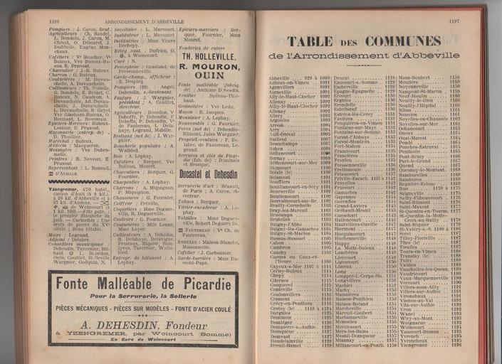 | Keywords: Annuaire générale d'Abbeville en 1924, p 1196-1197 fin d'Yvrencheux à Yzengrmer + table de communes de l'arr. d'abb..jpg Annuaire général d'Abbeville 1924 - Pages 1196-1197 <br>Communes d'Yvrencheux fin à Yzengremer + table des communes de l'arr d'Abbeville <br>Mentions d'activités commerciales et artisanales en 1924 Yzengremer Fonderie de fonte A Dehesdin own 2007-11-25 Groteddy Abbeville Directories of Abbeville 1924 directories Vaux-Marquenneville in 1924 Yvrencheux Yzengremer Woincourt |