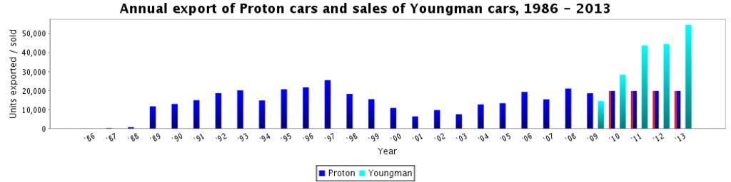 | Keywords: Annual export of Proton cars and sales of Youngman cars, 1986 - 2013 (s).png Uploaded with en wp UW marker 2014 03 10 Annual export of Proton cars and sales of Youngman cars rebadged Proton Gen-2 and Persona models 1986 - 2013 <br>As published by the Ministry of International Trade and Industry Malaysia and China Association of Automobile Manufacturers <br>Sources<br>http //goo gl/7a6Luz Annual export of Proton cars 1986 - 2009<br>http //goo gl/AcImq6 Annual sales of Youngman passenger cars 2009 May-Dec http //goo gl/no2e0O 2010 http //goo gl/bz48ez 2011 http //goo gl/tsPgrF 2012 http //goo gl/59myjO Jan-Nov http //goo gl/PngsKX 2013 Dec <br>Note<br>1 2009 sales data for Youngman cars only apply for units sold between May and December 2009 Sales data between January and April 2009 is not available <br>2 Official data for the years 2010 2011 2012 and 2013 for exported Proton cars have not been published The bar chart assumes that an average of 20 000 units are exported each year <br>3 Sales data for Youngman cars only include the rebadged Proton Gen-2 and Persona models and exclude Youngman's indigenously-designed cars <br><small>Raw data</small><br><small>Proton 25 443 861 11854 13131 15110 18788 20269 14968 20846 21891 25686 18422 15643 11022 6554 9875 7685 12870 13512 19478 15567 21261 18757 20000 20000 20000 20000<br>Youngman 0 0 0 0 0 0 0 0 0 0 0 0 0 0 0 0 0 0 0 0 0 0 0 14671 28555 43989 44778 54849</small> own 2014-03-11 Aero777 Proton automobile infographics Youngman Lotus automobiles |