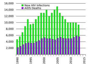 Keywords: Annual Mexico AIDS deaths.svg translate yes en New HIV infections each year and AIDS deaths occurring during the year in Mexico; data from http //www unaids org/en/media/unaids/contentassets/documents/document/2014/2014gapreportslides/HIV2013Estimates_1990-2013_22July2014 xlsx UNAIDS GAP Report 2014 2014-10-19 own Delphi234 other versions cc-zero AIDS statistics AIDS in Mexico Uploaded with UploadWizard |
