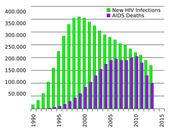 Keywords: Annual South Africa AIDS deaths.svg translate yes en New HIV infections each year and AIDS deaths occurring during the year in South Africa; data from http //www unaids org/en/media/unaids/contentassets/documents/document/2014/2014gapreportslides/HIV2013Estimates_1990-2013_22July2014 xlsx UNAIDS GAP Report 2014 2014-10-19 own Delphi234 other versions cc-zero AIDS statistics AIDS in South Africa Uploaded with UploadWizard |