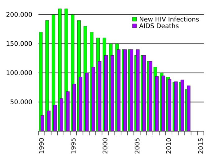 Keywords: Annual Tanzania AIDS deaths.svg translate yes en New HIV infections each year and AIDS deaths occurring during the year in the United Republic of Tanzania; data from http //www unaids org/en/media/unaids/contentassets/documents/document/2014/2014gapreportslides/HIV2013Estimates_1990-2013_22July2014 xlsx UNAIDS GAP Report 2014 2014-10-19 own Delphi234 other versions cc-zero AIDS statistics Health in Tanzania Uploaded with UploadWizard |