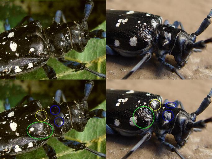 Keywords: Anoplophora glabripennis vs chinensis.jpg Anoplophora chinensis malasiaca side by side with some diagnostic characters indicated BLUE blueish-white hairy patches on pronotum only on A c malasiaca not on A c chinensis and A glabripennis sleek and black ; YELLOW Scutellum covered with blueish-white hair on A c malasiaca not on A c chinensis and A glabripennis black ; GREEN Base of elytra covered with tubercles on both A chinensis ssp but not on A glabripennis sleek or locally rough at most but not covered with tubercles own Pudding4brains Paolo Gibellini 2010-01-27 Original by Paolo Gibellini File Anoplophora_chinensis_2008 jpg Coleoptera anatomy Anoplophora P4bFnF |