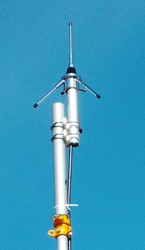 Keywords: Antenna UHF 01.JPG fr L'antenne ground plane UHF 450 MHz à 470 MHz ou GPA Ground Plane Antenna est un dipôle dans lequel on a remplacé la moitié par un « plan de sol » la moitié conservée étant normale à cette surface Si le plan de sol est suffisamment grand le demi-dipôle se comporte exactement comme un dipôle entier type dipôle demi-onde λ/2 car sa réflexion dans le plan de sol forme la partie manquante La longueur physique est environ égale au quart de la longueur d'onde de la fréquence sur laquelle l'antenne est accordée Ces brins disposés en cercle inclinés vers le bas ; en nombre de 3 ils constituent une surface conductrice de l'électricité même si cette surface n'est pas parfaite pour être alimenté par un câble coaxial de 50 ohms A UHF ground plane antenna for 450 MHz to 470 MHz The vertical whip is approximately one quarter of the wavelength of the radio waves and functions as a quarter-wave en monopole antenna The three downward pointing quarter wave whips extending from the base of the vertical function as a ground plane for the monopole They create an electrical image of the top whip on the other side of the ground plane The two antennas the monopole and its image are together equivalent to a half-wave dipole antenna so the radiation pattern of the ground plane antenna is the same as the top half of the pattern of the half wave dipole It is omnidirectional radiating maximum power in horizontal directions with the power declining with elevation angle to zero on the antenna's axis The maximum gain is twice 3 dB more than that of a half wave dipole's 2 19 dBi or 5 19 dBi If the ground plane wires extended out horizontally from the base of the monopole the impedance would be half that of the dipole or 36 5 ohms However the downward slant of the ground plane wires serves to increase the antenna impedance so the antenna is a good match for the 50 ohm coaxial cable feedline 2012-10-07 09 10 06 own F1jmm picture manager bright F1jmm Uploaded with UploadWizard Monopole antennas Photos by User F1jmm |