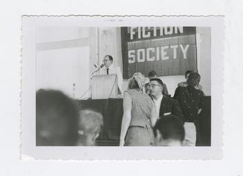 Keywords: 14th world science fiction convention 14thworldsciencefictionconvention wsfs world science fiction society worldsciencefictionsociety science fiction sciencefiction new york city newyorkcity 1956 worldcon blackandwhite black and white Collection of photographic snapshots from the 14th World Science Fiction Convention, also known as NyCon II or NEWYORCON, held August 31–September 3, 1956, at the Biltmore Hotel in New York, New York, USA. The chairman was David A. Kyle. The Guest of Honor was Arthur C. Clarke. The toastmaster was Robert Bloch. The Secretary was Ruth Evelin Kyle NOTE: Please help identify these photos! Please contribute by using comments or emailing: nothinghappenedhere@gmail.com Provenance: The collection of 23 snapshots was purchased from a thrift store in Santa Barbara, California on December 31, 2015. Others who may be featured in the photos: (Please help identify!) Ted White Bob Tucker (Wilson Tucker) Boyd Raeburn Jean & Andy Young Dick Eney Ron Ellik Larry Stark Richalex Kirs Robert Silverberg Damon Knight Willy Ley Frank Kelly Freas Murray Leinster Robert A. Heinlein Robert Bloch Collection of photographic snapshots from the 14th World Science Fiction Convention, also known as NyCon II or NEWYORCON, held August 31–September 3, 1956, at the Biltmore Hotel in New York, New York, USA. The chairman was David A. Kyle. The Guest of Honor was Arthur C. Clarke. The toastmaster was Robert Bloch. The Secretary was Ruth Evelin Kyle NOTE: Please help identify these photos! Please contribute by using comments or emailing: nothinghappenedhere@gmail.com Provenance: The collection of 23 snapshots was purchased from a thrift store in Santa Barbara, California on December 31, 2015. Others who may be featured in the photos: (Please help identify!) Ted White Bob Tucker (Wilson Tucker) Boyd Raeburn Jean & Andy Young Dick Eney Ron Ellik Larry Stark Richalex Kirs Robert Silverberg Damon Knight Willy Ley Frank Kelly Freas Murray Leinster Robert A. Heinlein Robert Bloch
