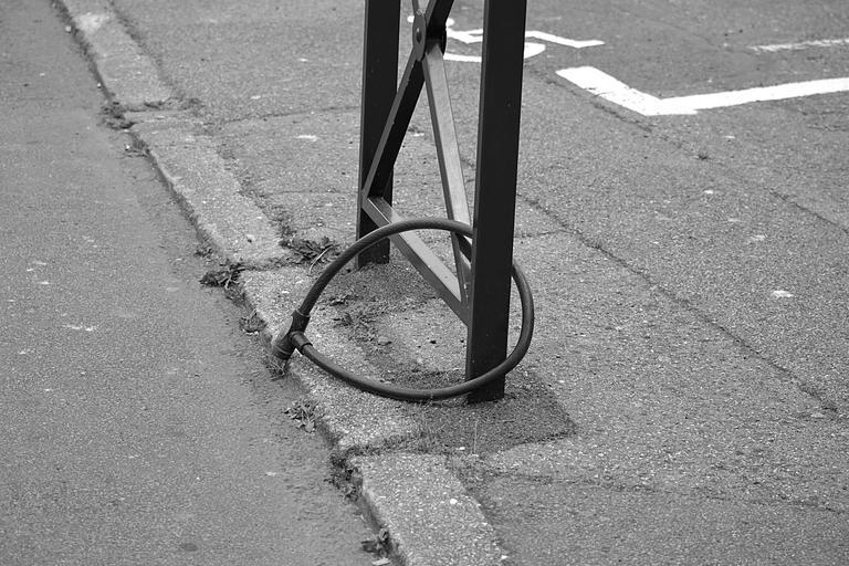 Keywords: anti-theft padlock security black and white city urban street sidewalk two wheels