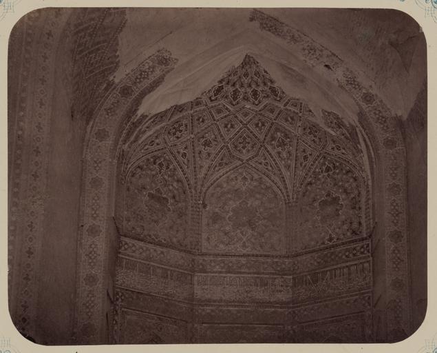 Keywords: Antiquities of Samarkand. Inner Courtyard of the Shir Dar Madrasah (Eastern Side). Inscriptions around the Inner Niche and Its Upper Sections. Center WDL3800.png Artwork ru Богаевский иколай Владими ович 1843 1912 гг fr Bogaevskii Nikolaï V 1843-1912 en Bogaevskii Nikolai V 1843-1912 zh 亚历山大·L· ,1840-1888 年 pt Bogaevskii Nikolai V 1843-1912 ar بوغافسكي، نيكولاي ف ، 1843-1912 es Bogaevskii Nikolai V 1843-1912 ru Сама кандские д евности Внут енний дво мед есе Ши -До восточная сто она адписи вок уг внут енней ниши и ее ве хних секций Цент fr Antiquités de Samarcande Cour intérieure de la madrasa de Shir Dar côté est Inscriptions autour de la niche intérieure et ses coupes supérieures Centre en Antiquities of Samarkand Inner Courtyard of the Shir Dar Madrasah Eastern Side Inscriptions around the Inner Niche and Its Upper Sections Center zh 撒马尔罕古迹 尔·达伊斯兰教学校内部庭院( 侧) 内部壁龛四周的铭文及壁龛的上半部分 中间部分 pt Antiguidades de Samarcanda Pátio interno da madrassa Shir Dar lado leste Inscrições em volta do nicho interno e suas seções superiores Centro ar آثار سمرقند الفناء الداخلي لمدرسة شيردور الجهة الشرقية نقوش حول المِشْكاة الداخلية وأجزائها العلوية المنتصف ru Эта фотог афия внут еннего дво а мед есе Ши -До в Сама канде Узбекистан соде жится в а хеологической части <em> Ту кестанского альбома </em> Шеститомное фотог афическое исследование было п оведено в 1871 1872 гг под уководством гене ала Константина П фон Кауфмана пе вого гене ал-губе нато а 1867 1882 гг Ту кестана как называли те ито ию Цент альной Азии п инадлежавшую Российской импе ии В альбоме уделяется особое внимание исламской а хитекту е Сама канда в том числе памятникам XIV и XV вв пе иода п авления Тиму а Таме лана и его п еемников В цент е Сама канда находится ансамбль Регистан объединяющий в себе т и основных об азца <em>madrasah</em> мед есе елигиозных школ Вто ое мед есе в ансамбле Ши -До было пост оено в 1619 1636 гг во в емена династии Ашта ханидов есмот я на значительные пов еждения нанесенные мед есе в течение многих веков оно остается одним из самых богато ук ашенных памятников в Цент альной Азии Фо ма этого мед есе является типичной для егиона  п ямоугольный дво ок уженный двухэтажной а кадой кото ая соде жит комнаты для ученых Здесь видна ниша <em>iwan</em> сводчатый зал с одним отк ытым концом ок уженный с т ех сто он стенами в цент е восточной стены Пове хности пок ыты многоцветной плиткой майоликой создающей геомет ические и ботанические узо ы ижние панели со ст ельчатыми а ками заканчиваются го изонтальной полосой надписей в витиеватом укописном стиле Ве хняя часть ниши демонст и ует сложную систему пе есекающихся сводов <br>А хитекту ные ук ашения и деко ативные элементы; адписи; Исламская а хитекту а; ед есе; Фотог афические исследования fr Cette photographie de l'intérieur de la cour de la madrasa de Shir Dar à Samarcande Ouzbékistan est extraite de l'ouvrage archéologique <em>Album du Turkestan</em> Cet inventaire photographique en six volumes fut réalisé entre 1871 et 1872 sous le patronage du général Konstantin P von Kaufman premier gouverneur général 1867-1882 du Turkestan nom donné aux territoires d'Asie centrale de l'Empire russe L'album porte une attention particulière à l'architecture islamique de Samarcande avec notamment des monuments datant des XIV<sup>e</sup> et XV<sup>e</sup> siècles lors du règne de Tamerlan et de ses successeurs Situé au centre de Samarcande l'ensemble du Registan est composé de trois exemples majeurs de <em>madrasa</em> école religieuse La seconde madrasa de l'ensemble celle de Shir Dar fut construite entre 1619 et 1636 au cours de la dynastie astrakane Malgré les dommages considérables subis au cours des siècles elle demeure l'un des monuments les plus luxueusement décorés d'Asie centrale Typique de la région cette madrasa est formée d'une cour rectangulaire entourée d'une arcade à deux étages qui contient des salles réservées aux érudits La niche de l'<em>aivan </em> salle voûtée dotée de trois murs et d'un côté ouvert est visible ici au centre du mur est Les surfaces sont recouvertes de carreaux de majolique polychromes formant des motifs géométriques et à fleurs Une bande d'inscription horizontale en style cursif fleuri surplombe les panneaux inférieurs dotés d'arches pointues Un système complexe de voûtes entrelacées est présent dans la partie supérieure de la niche <br>Décora