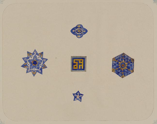 | Keywords: Antiquities of Samarkand. Madrasah of Bibi Khanym. Congregational Mosque (Friday Mosque). Samples of Tiles Used to Decorate Exterior Walls WDL3932.png Artwork ru Шостак Л А fr Shostak L A en Shostak L A zh L A ·斯塔克 pt Shostak L A ar شوستاك، ل أ es Shostak L A ru Сама кандские д евности ед есе Биби Ханым Собо ная мечеть мечеть джами Об азцы плиток использованных для отделки на ужных стен fr Antiquités de Samarcande Madrasa de Bibi Khanym Mosquée de congrégation Mosquée du Vendredi Échantillons de carreaux utilisés pour l'ornement des murs extérieurs en Antiquities of Samarkand Madrasah of Bibi Khanym Congregational Mosque Friday Mosque Samples of Tiles Used to Decorate Exterior Walls zh 撒马尔罕古迹 比比·哈努姆伊斯兰教学校 大清 寺(星 五清 寺) 用于装饰外墙的瓷砖样例 pt Antiguidades de Samarcanda Madrassa de Bibi Khanym Mesquita congregacional mesquita de sexta-feira Amostras dos azulejos utilizados para decorar paredes externas ar آثار سمرقند مدرسة بيبي خانوم المسجد الجامع مسجِد الجُمعة عينات من البلاط المُستخدم لزخرفة الجدران الخارجية ru Эти исунки многоцветных ке амических о наментов главной мечети ансамбля Биби Ханым в Сама канде Узбекистан соде жатся в а хеологической части <em> Ту кестанского альбома </em> Шеститомное фотог афическое исследование было подготовлено и издано в 1871 1872 гг под пат онажем гене ала Константина П фон Кауфмана пе вого гене ал-губе нато а 1867 1882 гг Ту кестана как называли в то в емя те ито ию Цент альной Азии п инадлежавшую Российской импе ии В альбоме уделяется особое внимание исламской а хитекту е Сама канда в том числе памятникам XIV и XV вв пе иода п авления Тиму а Таме лана и его п еемников Пост оенный в 1399 1405 гг за счет т офеев добытых в победоносной индийской кампании Тиму а ансамбль Биби Ханым был местом асположения главной или пятничной мечети го ода названной в честь ста шей жены Тиму а Са ай ульк Ханым ечеть находящаяся в цент е ансамбля является одной из к упнейших в ми е Л А Шостак сделал несколько аква ельных за исовок ке амических элементов фасадов мечети Здесь п едставлены све ху по часовой ст елке четы ехлистный о намент с цветочными мотивами; шестиугольный узо с цветочными мотивами асходящимися из цент а; пятиконечная звезда с цветочными мотивами; десятиконечная звезда с завитками асходящимися из пятиконечной звезды на фасадах мина етов главной мечети В цент е асположена ке амическая плитка с куфическими буквами есмот я на п остоту исунков в них есть то что нельзя увидеть на фотог афиях той эпохи <br>А хитекту ные ук ашения и деко ативные элементы; Исламское искусство; озаика; Аква ельные исунки fr Ces dessins d'ornements de céramique polychrome de la mosquée principale de l'ensemble de Bibi Khanym à Samarcande Ouzbékistan sont extraits de l'ouvrage archéologique <em>Album du Turkestan</em> Cet inventaire photographique en six volumes fut réalisé entre 1871 et 1872 sous le patronage du général Konstantin P von Kaufman premier gouverneur général 1867-1882 du Turkestan nom donné aux territoires d'Asie centrale de l'Empire russe L'album consacre une attention particulière à l'architecture islamique de Samarcande avec notamment des monuments datant des XIV<sup>e</sup> et XV<sup>e</sup> siècles lors du règne de Tamerlan et de ses successeurs Construit entre 1399 et 1405 avec le butin de la campagne de Tamerlan en Inde l'ensemble de Bibi Khanym était l'emplacement de la mosquée principale de la ville ou Mosquée du Vendredi nommée en hommage à la première épouse de Tamerlan Sarai Mulk Khanym La mosquée une des plus grandes du monde se trouve au centre de l'ensemble L A Shostak réalisa des copies à l'aquarelle de ces détails des céramiques des façades de la mosquée Les dessins présentés ici incluent à partir du haut et dans le sens des aiguilles d'une montre un ornement à quatre lobes contenant des motifs à fleurs une figure hexagonale avec des motifs à fleurs partant du centre une étoile à cinq branches dotée de motifs à fleurs et une étoile à dix branches décorée de vrilles qui s'étendent d'une étoile à cinq branches sur les façades des minarets de la mosquée principale Au centre un carreau contient des lettres kufiques angulaires Bien que ces détails soient simplifiés ce type de dessin fournit des informations qui ne sont pas disponibles sur la photographie de l'époque <br>Décorations et ornements architecturaux; Art islamique; Carreaux; Aquarelles en These sketches of polychrome ceramic ornaments at the main 