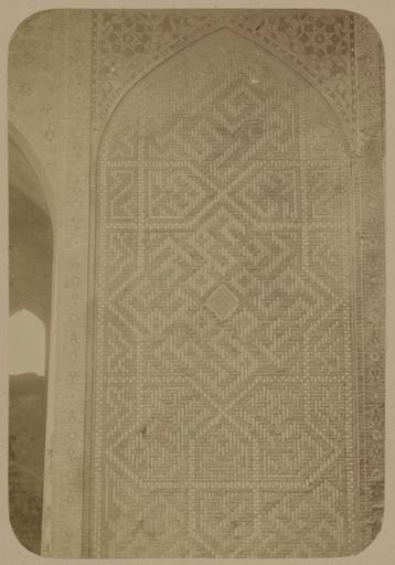 | Keywords: Antiquities of Samarkand. Madrasah of Bibi Khanym. Congregational Mosque WDL3758.png Artwork ru Богаевский иколай Владими ович 1843 1912 гг fr Bogaevskii Nikolaï V 1843-1912 en Bogaevskii Nikolai V 1843-1912 zh 亚历山大·L· ,1840-1888 年 pt Bogaevskii Nikolai V 1843-1912 ar بوغافسكي، نيكولاي ف ، 1843-1912 es Bogaevskii Nikolai V 1843-1912 ru Сама кандские д евности ед есе Биби Ханым Собо ная мечеть fr Antiquités de Samarcande Madrasa de Bibi Khanym Mosquée de congrégation en Antiquities of Samarkand Madrasah of Bibi Khanym Congregational Mosque zh 撒马尔罕古迹 比比·哈努姆伊斯兰教学校 公理会清 寺 pt Antiguidades de Samarcanda Madrassa de Bibi Khanym Mesquita congregacional ar آثار سمرقند مدرسة بيبي خانوم المسجد الجامِع ru Эта фотог афия ке амической панели фасада главной мечети ансамбля Биби Ханым в Сама канде Узбекистан соде жится в а хеологической части <em> Ту кестанского альбома </em> Шеститомное фотог афическое исследование было п оведено в 1871 1872 гг под уководством гене ала Константина П фон Кауфмана пе вого гене ал-губе нато а 1867 1882 гг Ту кестана как называли те ито ию Цент альной Азии п инадлежавшую Российской импе ии В альбоме уделяется особое внимание исламской а хитекту е Сама канда в том числе памятникам XIV и XV вв пе иода п авления Тиму а Таме лана и его п еемников Пост оенный в 1399 1405 гг с использованием т офеев индийской кампании Тиму а ансамбль Биби Ханым был местом асположения главной или пятничной мечети го ода названной в честь ста шей жены Тиму а Са ай ульк Ханым ечеть находящаяся в цент е ансамбля является одной из к упнейших в исламском ми е Вследствие асположения в активной сейсмической зоне как и всем ст оениям в ансамбле мечети был нанесен се ьезный уще б Здесь показана ке амическая панель ве хнего п авого угла фасада асположенная в п еделах ог омной а ки входа <em>iwan</em> сводчатый зал с одним отк ытым концом ок уженный с т ех сто он стенами Здесь показана се ия ке амических ук ашений включающая в себя сложные геомет ические фигу ы пок ытые куфическим письмом а также деко ативные ве тикальные полосы с геомет ическими и цветочными узо ами Слева видна <em>peshtak</em> а ка фасада над по талом ведущим в куполооб азную внут еннюю часть <br>А хитекту ные ук ашения и деко ативные элементы; Исламская а хитекту а; ина еты; ечети; Фотог афические исследования fr Cette photographie d'un panneau de céramique sur la façade de la mosquée principale de l'ensemble de Bibi Khanym à Samarcande Ouzbékistan est extraite de l'ouvrage archéologique <em>Album du Turkestan</em> Cet inventaire photographique en six volumes fut réalisé entre 1871 et 1872 sous le patronage du général Konstantin P von Kaufman premier gouverneur général 1867-1882 du Turkestan nom donné aux territoires d'Asie centrale de l'Empire russe L'album consacre une attention particulière à l'architecture islamique de Samarcande avec notamment des monuments datant des XIV<sup>e</sup> et XV<sup>e</sup> siècles lors du règne de Tamerlan et de ses successeurs Construit entre 1399 et 1405 avec le butin de la campagne de Tamerlan en Inde l'ensemble de Bibi Khanym était l'emplacement de la mosquée principale de la ville ou Mosquée du Vendredi nommée en hommage à la première épouse de Tamerlan Sarai Mulk Khanym La vaste structure de la mosquée une des plus grandes du monde islamique se trouve au centre de l'ensemble l'instar de toutes les structures de l'ensemble la mosquée a subi des dommages considérables dus à l'activité sismique de cette région Cette vue montre un panneau de céramique sur la partie supérieure droite de la façade situé dans le grand arceau de l'<em>aivan</em> salle voûtée dotée de trois murs et d'un côté ouvert de l'entrée De multiples ornements en céramique notamment des figures géométriques complexes comportant une écriture kufique angulaire et des bandes verticales décoratives de motifs géométriques et à fleurs sont illustrés ici Le <em>peshtak</em> arceau de façade est visible à gauche au-dessus du portail menant vers l'intérieur voûté <br>Décorations et ornements architecturaux; Architecture islamique; Minarets; Mosquées; Inventaires photographiques en This photograph of a ceramic panel on the facade of the main mosque at the Bibi Khanym ensemble in Samarkand Uzbekistan is from the archeological part of <em>Turkestan Album</em> The six-volume photographic survey was produced in 1871-72 under the patronage of General Konstantin P von Kaufman the first governor-general 1867-82 of Turkestan as the Russian Empire s Central Asian territories were