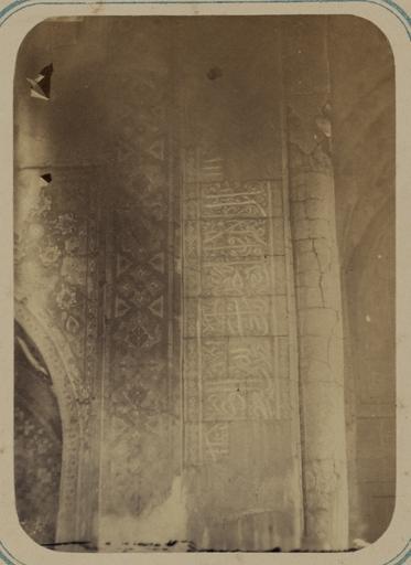 | Keywords: Antiquities of Samarkand. Madrasah of Nadir Divan-Begi. Inscriptions Around the Main Niche of the Northern Facade WDL3782.png Artwork ru Богаевский иколай Владими ович 1843 1912 гг fr Bogaevskii Nikolaï V 1843-1912 en Bogaevskii Nikolai V 1843-1912 zh 亚历山大·L· ,1840-1888 年 pt Bogaevskii Nikolai V 1843-1912 ar بوغافسكي، نيكولاي ف ، 1843-1912 es Bogaevskii Nikolai V 1843-1912 ru Сама кандские д евности ед есе ади Диван-Беги адписи по сто онам главной ниши севе ного фасада fr Antiquités de Samarcande Madrasa de Nadir Divan-Begi Inscriptions autour de la niche principale de la façade nord en Antiquities of Samarkand Madrasah of Nadir Divan-Begi Inscriptions Around the Main Niche of the Northern Facade zh 撒马尔罕古迹 纳迪尔·迪万- 吉伊斯兰教学校 北立 主壁龛四周的铭文 pt Antiguidades de Samarcanda Madrassa de Nadir Divan-Begi Inscrições em torno do nicho principal da fachada norte ar آثار سمرقند مدرسة نذير ديفان بيغي نقوش حول المِشْكاة الرئيسية للواجهة الشمالية ru Эта фотог афия мед есе ади Диван-Беги в Сама канде Узбекистан соде жится в а хеологической части <em> Ту кестанского альбома </em> Шеститомное фотог афическое исследование было подготовлено и издано в 1871 1872 гг под пат онажем гене ала Константина П фон Кауфмана пе вого гене ал-губе нато а 1867 1882 гг Ту кестана как называли в то в емя те ито ию Цент альной Азии п инадлежавшую Российской импе ии В альбоме уделяется особое внимание исламскому а хитекту ному наследию Сама канда Эта <em>мед есе</em> елигиозная школа асположенная ядом с усыпальницей Ходжа Ах а была пост оена в 1631 г ади ом Диван-Беги визи ем и дядей буха ского п авителя Имам-Кули Хана ед есе была заплани ована в виде п ямоугольного дво а ок уженного одноэтажной к ытой гале еей для ученых а этой фотог афии изоб ажена а ка <em>айвана</em> сводчатого зала с одним отк ытым концом ок уженного с т ех сто он стенами в ок уженном к ытыми гале еями дво е есмот я на се ьезные пов еждения на внешней сто оне фасада айвана видна полоса с надписями выполненными удлиненными укописными буквами Рядом с а кой видны остатки ве тикальных полос из ке амических плиток об азующих геомет ические узо ы Вок уг ве шины а ки айвана слева находятся ф агменты фаянсовой мозаики с ботаническими узо ами В нише а ки также видны едва азличимые цветочные мотивы П ост анство между этими линиями заполнено искусными многоцветными ке амическими узо ами Основным цветом является темно-синий с элементами белого желтого о анжевого и зеленого <br>А хитекту ные ук ашения и деко ативные элементы; адписи; Исламская а хитекту а; ед есе; Фотог афические исследования fr Cette photographie de la mosquée de Madrasa de Nadir Divan-Begi à Samarcande Ouzbékistan est extraite de l'ouvrage archéologique <em>Album du Turkestan</em> Cet inventaire photographique en six volumes fut réalisé entre 1871 et 1872 sous le patronage du général Konstantin P von Kaufman premier gouverneur général 1867-1882 du Turkestan nom donné aux territoires d'Asie centrale de l'Empire russe L'album consacre une attention particulière à l'héritage de l'architecture islamique de Samarcande Jouxtant le sanctuaire de Khodzha Akhrar cette <em>madrasa</em> école religieuse fut achevée en 1631 sous Nadir Divan-Begi vizir et oncle du souverain de Boukhara Imam-Quli Khan Elle fut conçue comme une cour rectangulaire entourée d'un cloître à un étage pour les érudits Cette vue présente l'arceau d'un <em>aivan</em> salle voûtée dotée de trois murs et d'un côté ouvert dans la cour entourée d'un cloître Malgré des dommages considérables la surface extérieure de la façade de l'aivan comporte encore une bande d'inscription avec des lettres cursives allongées écriture thoulouth Les côtés de l'arceau arborent les vestiges des bandes verticales de carreaux de céramique qui forment des motifs géométriques Des fragments de mosaïques de faïence avec des motifs à fleurs apparaissent autour de la pointe de l'arceau de l'aivan à gauche Le fond de la niche voûtée comporte également des motifs à fleurs à peine visibles Ces lignes sont constituées de motifs de céramique polychromes sophistiqués La couleur de base est le bleu foncé avec des détails en blanc jaune orange et vert <br>Décorations et ornements architecturaux; Inscriptions; Architecture islamique; Madrasas; Inventaires photographiques en This photograph of the Nadir Divan-Begi Madrasah in Samarkand Uzbekistan is from the archeological part of <em>Turkestan Album</em> Th