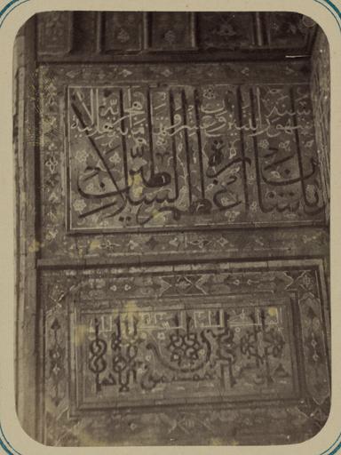 | Keywords: Antiquities of Samarkand. Madrasah of Ulugh Beg. Inscription in the Main Niche in Its Upper Part. End WDL3815.png Artwork ru Богаевский иколай Владими ович 1843 1912 гг fr Bogaevskii Nikolaï V 1843-1912 en Bogaevskii Nikolai V 1843-1912 zh 亚历山大·L· ,1840-1888 年 pt Bogaevskii Nikolai V 1843-1912 ar بوغافسكي، نيكولاي ف ، 1843-1912 es Bogaevskii Nikolai V 1843-1912 ru Сама кандские д евности ед есе Улугбека адпись в главной нише в ве хней ее части Конец fr Antiquités de Samarcande Madrasa d'Ulugh Beg Inscription dans la partie supérieure de la niche principale Fin en Antiquities of Samarkand Madrasah of Ulugh Beg Inscription in the Main Niche in Its Upper Part End zh 撒马尔罕古迹 鲁伯· 格伊斯兰教学校 主壁龛上半部分的铭文 结 部分 pt Antiguidades de Samarcanda Madrassa de Ulugh Beg Inscrição no nicho principal em sua parte superior Fim ar آثار سمرقند مدرسة أُلوك بيك نقش بالجزء العلوي من المِشْكاة الرئيسية النهاية ru Эта фотог афия ке амических панелей в мед есе Улугбека в Сама канде Узбекистан соде жится в а хеологической части <em> Ту кестанского альбома </em> Шеститомное фотог афическое исследование было подготовлено и издано в 1871 1872 гг под пат онажем гене ала Константина П фон Кауфмана пе вого гене ал-губе нато а 1867 1882 гг Ту кестана как называли в то в емя те ито ию Цент альной Азии п инадлежавшую Российской импе ии В альбоме уделяется особое внимание исламской а хитекту е Сама канда в том числе памятникам XIV и XV вв пе иода п авления Тиму а Таме лана и его п еемников В цент е Сама канда находится ансамбль Регистан объединяющий в себе т и основных об азца <em>madrasah</em> мед есе елигиозных школ Самая ста ая мед есе площади Регистан была пост оена в 1417 1420 гг Улугбеком 1393 1449 гг п авителем-аст ономом и внуком Тиму а и названа в его честь За в емя п авления Улугбека мед есе посещали около 100 учеников и она считалась ведущим цент ом исламского об азования Здесь показаны ке амические панели ве хней части ниши а ки ог омного <em>айвана</em> сводчатого зала с одним отк ытым концом ок уженного с т ех сто он стенами со дво а Изящные многоцветные ук ашения включают панель с удлиненными буквами пе сидско-а абского письма с пе еплетающимися цветочными мотивами Под надписью асположена еще одна фаянсовая панель с геомет ическими фигу ами внут и узо а из завитков Обе панели окаймлены полосами с геомет ическими и цветочными узо ами а самом ве ху фотог афии видны ке амические элементы составляющие основу свода ниши Главным цветом является синий <br>А хитекту ные ук ашения и деко ативные элементы; адписи; Исламская а хитекту а; ед есе; Фотог афические исследования fr Cette photographie de panneaux de céramique de la madrasa d'Ulugh Beg à Samarcande Ouzbékistan est extraite de l'ouvrage archéologique <em>Album du Turkestan</em> Cet inventaire photographique en six volumes fut réalisé entre 1871 et 1872 sous le patronage du général Konstantin P von Kaufman premier gouverneur général 1867-1882 du Turkestan nom donné aux territoires d'Asie centrale de l'Empire russe L'album consacre une attention particulière à l'architecture islamique de Samarcande avec notamment des monuments datant des XIV<sup>e</sup> et XV<sup>e</sup> siècles lors du règne de Tamerlan et de ses successeurs Situé au centre de Samarcande l'ensemble du Registan est composé de trois exemples majeurs de <em>madrasa</em> école religieuse La madrasa la plus ancienne sur la place du Registan porte le nom du roi-astronome et petit-fils de Tamerlan Ulugh Beg vers 1393-1449 qui la construisit entre 1417 et 1420 Pendant le règne d'Ulugh Beg la madrasa était considérée comme un centre important de l'éducation islamique et comptait près de 100 étudiants Les panneaux de céramique présentés ici appartiennent à la partie supérieure de la niche du grand arceau de l'<em>aivan </em> salle voûtée dotée de trois murs et d'un côté ouvert dans la cour La décoration polychrome sophistiquée inclut un panneau d'inscription en caractères allongés perso-arabes entrelacés de motifs à fleurs Sous cette inscription un autre panneau de faïence est orné de figures géométriques disposées dans des motifs de vrilles Les deux panneaux sont bordés de bandes de motifs géométriques et à fleurs Des éléments de céramique composant la base de la voûte de la niche sont visibles dans la partie supérieure de la photographie La couleur dominante est le bleu foncé <br>Décorations et ornements archite