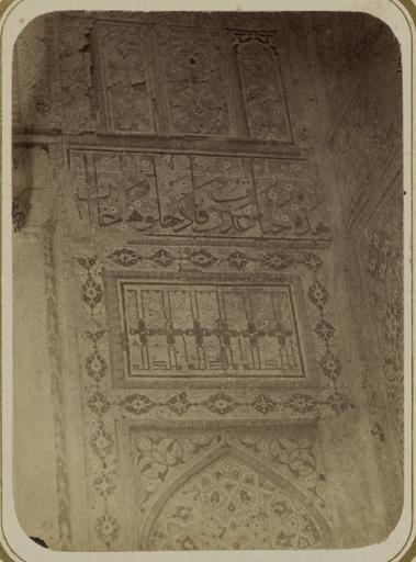 | Keywords: Antiquities of Samarkand. Mausoleum of the Emir Timur Kuragan (Gur-Emir). Inscription along the Sides and inside the Main Entry Niche WDL3724.png Artwork ru Богаевский иколай Владими ович 1843 1912 гг fr Bogaevskii Nikolaï V 1843-1912 en Bogaevskii Nikolai V 1843-1912 zh 亚历山大·L· ,1840-1888 年 pt Bogaevskii Nikolai V 1843-1912 ar بوغافسكي، نيكولاي ف ، 1843-1912 es Bogaevskii Nikolai V 1843-1912 ru Сама кандские д евности авзолей эми а Тиму а Ку агана Гу -Эми адписи по сто онам и внут и главной входной ниши fr Antiquités de Samarcande Mausolée de l'émir Timour Kuragan Gour Emir Inscription le long des côtés et à l'intérieur de la niche de l'entrée principale en Antiquities of Samarkand Mausoleum of the Emir Timur Kuragan Gur-Emir Inscription along the Sides and inside the Main Entry Niche zh 撒马尔罕古迹 埃米尔帖 儿·库拉甘的陵墓(古尔-埃米尔) 主入口壁龛外侧与内侧的铭文 pt Antiguidades de Samarcanda Mausoléu de Tamerlão Gur-Emir Inscrição nas laterais e dentro do nicho da entrada principal ar آثار سمرقند ضريح الأمير تيمور كوراغان گورِ أمير نقش بطول الجانبين وداخل مِشْكاة المدخل الرئيسي ru Эта фотог афия детали главной входной а ки во дво мавзолея Гу -Эми в Сама канде Узбекистан соде жится в а хеологической части <em> Ту кестанского альбома </em> Шеститомное фотог афическое исследование было подготовлено и издано в 1871 1872 гг под пат онажем гене ала Константина П фон Кауфмана пе вого гене ал-губе нато а 1867 1882 гг Ту кестана как называли в то в емя те ито ию Цент альной Азии п инадлежавшую Российской импе ии В альбоме уделяется особое внимание исламскому а хитекту ному наследию Сама канда включая Гу -Эми на пе сидском языке означает г обница повелителя Гу -Эми известен в пе вую оче едь как место захо онения Тиму а Таме лана хотя Тиму начал его ст оительство еще в 1403 г в память своего любимого внука ухаммада Султана уме шего в воз асте 27 лет После похо он Тиму а в 1405 г Гу -Эми стал мавзолеем Тиму идов а фотог афии видно левое к ыло а ки входной ниши <em>айвана</em> сводчатый зал с одним отк ытым концом ок уженный с т ех сто он стенами Хотя фасад пост адал здесь п едставлены азнооб азные многоцветные ке амические ук ашения асположенные на четы ех у овнях Панель ст ельчатой а ки в нижней части соде жит цветочные мотивы внут и сложного геомет ического узо а а панели над ней изоб ажена деко ативная сетка с цветочными элементами а следующей панели видна пе сидско-а абская надпись удлиненным письмом пе емежающаяся с цветочными узо ами а ве хнем у овне находится го изонтальная полоса из фаянсовых сегментов с лучистыми цветочными фигу ами <br>А хитекту ные ук ашения и деко ативные элементы; адписи; Исламская а хитекту а; Фотог афические исследования; огильные памятники; Тиму 1336-1405 гг ; Г обницы fr Cette photographie des détails de l'arceau de l'entrée principale menant vers la cour du mausolée de Gour Emir à Samarcande Ouzbékistan est extraite de l'ouvrage archéologique <em>Album du Turkestan</em> Cet inventaire photographique en six volumes fut réalisé entre 1871 et 1872 sous le patronage du général Konstantin P von Kaufman premier gouverneur général 1867-1882 du Turkestan nom donné aux territoires d'Asie centrale de l'Empire russe L'album consacre une attention particulière à l'héritage de l'architecture islamique de Samarcande notamment Gour Emir « tombe du souverain » en persan Bien qu'il soit principalement connu comme le lieu de sépulture de Tamerlan Gour Emir fut commencé sous Tamerlan en 1403 pour commémorer la mort de son petit-fils bien-aimé le sultan Mahomet à l'âge de 27 ans Lorsque Tamerlan y fut enterré en 1405 Gour Emir devint le mausolée des Timourides Cette vue présente le flanc gauche de la niche située dans l'arceau de l'<em>aivan </em> salle voûtée dotée de trois murs et d'un côté ouvert de la structure d'entrée Malgré les dommages sur la façade les quatre niveaux dans cette vue présentent des ornements en céramique polychrome variés Dans la partie inférieure le panneau de lambris est décoré de figures à fleurs disposées dans des motifs géométriques sophistiqués Au-dessus le panneau contient une grille décorative et des éléments floraux Le dernier panneau est doté d'une inscription perso-arabe en caractères allongés entrelacés de motif à fleurs Une bande horizontale composée de segments de faïence avec des figures à fleurs rayonnantes occupe la partie supérieure de la photo