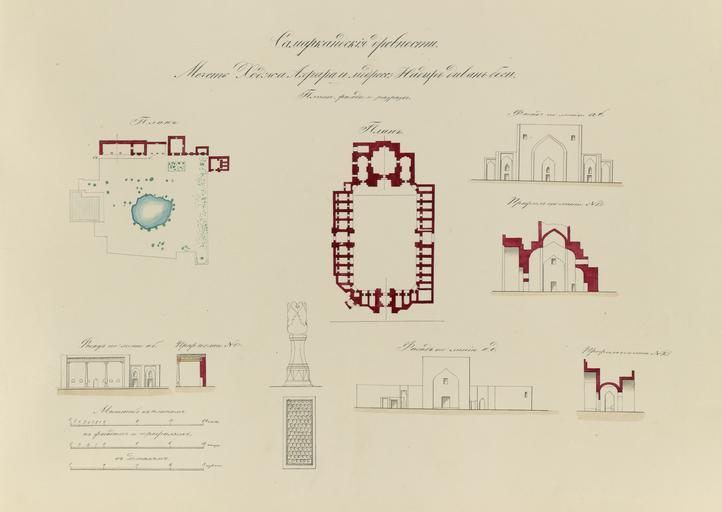 View Original:Antiquities_of_Samarkand._Mosque_of_Khodzha_Akhrar_and_Madrasah_of_Nadir_Divan-Begi._Plans,_Elevations,_and_Sections_WDL3581.png (1443x1024)