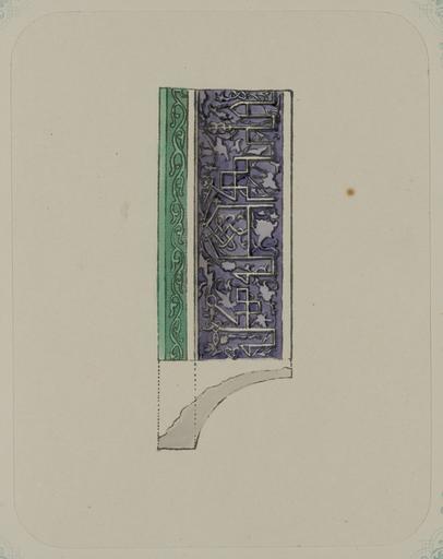 | Keywords: Antiquities of Samarkand. Tomb of the Saint Kusam-ibn-Abbas (Shah-i Zindah) and Adjacent Mausoleums. Mausoleum of Sha Arap. Section of Inscription on the Facade WDL3913.png Artwork ru Шостак Л А fr Shostak L A en Shostak L A zh L A ·斯塔克 pt Shostak L A ar شوستاك، ل أ es Shostak L A ru Сама кандские д евности Г обница святого Куссама ибн Абасса Шах-Зиндэ и мавзолеи п и ней авзолей Ша-А ап Часть надписи на фасаде fr Antiquités de Samarcande Sépulcre de Kusam-ibn-Abbas Shah-i Zindah et mausolées adjacents Mausolée de Sha Arap Section d'une inscription sur la façade en Antiquities of Samarkand Tomb of the Saint Kusam-ibn-Abbas Shah-i Zindah and Adjacent Mausoleums Mausoleum of Sha Arap Section of Inscription on the Facade zh 撒马尔罕古迹 库萨姆-伊 -阿巴斯之墓(夏伊辛达)及其邻近陵墓 沙·阿拉普的陵墓 立 上的铭文片段 pt Antiguidades de Samarcanda Túmulo do Santo Kusam-ibn-Abbas Shah-i Zindah e mausoléus adjacentes Mausoléu de Sha Arap Seção da inscrição na fachada ar آثار سمرقند ضَرِيح الوَلِيّ قثم بن عباس شاه زنده والأضرحة المجاورة ضريح شاء آراب جزء من النقش الموجود على الواجهة ru Эта аква ель с изоб ажением ф агмента фасада неизвестного мавзолея асположенного в севе ной г уппе усыпальниц нек ополя Шах-Зиндэ Сама канд Узбекистан соде жится в а хеологической части <em> Ту кестанского альбома </em> Шеститомное фотог афическое исследование было подготовлено и издано в 1871 1872 гг под пат онажем гене ала Константина П фон Кауфмана пе вого гене ал-губе нато а 1867 1882 гг Ту кестана как называли в то в емя те ито ию Цент альной Азии п инадлежавшую Российской импе ии В альбоме уделяется особое внимание исламской а хитекту е Сама канда в том числе памятникам XIV и XV вв пе иода п авления Тиму а Таме лана и его п еемников Особенно следует отметить ансамбль Шах-Зиндэ на пе сидском языке означает живой ца ь кото ый пост оен на возвышенности бывшей местом д евнего поселения известного как Аф асиаб Шах-Зиндэ почитается как мемо иал Куссама ибн Абасса двою одного б ата п о ока ухаммада Заказчик этого мавзолея окончательно не оп еделен однако дата его ст оительства известна 1360 1361 гг Фасад мавзолея ук ашен ке амикой с я ким многоцветным о наментом А ка фасада или <em>пештак</em> с обеих сто он ок ужена глазу ованными колоннами из те акоты и ве тикальными деко ативными полосами Показанный на исунке ф агмент об азует левый внешний угол а очной ниши Он ук ашен куфической надписью в сочетании с пе еплетающимися полосами и цветочными мотивами Линия сечения в нижней части ф агмента указывает на то что он имеет вогнутую фо му <br>А хитекту ные ук ашения и деко ативные элементы; Исламская а хитекту а; огильные памятники; Шах-Зиндэ; Г обницы; Аква ельные исунки fr Cette esquisse d'un fragment de la façade d'un mausolée non identifié situé au nord de l'ensemble des sanctuaires de la nécropole de Shah-i Zindah à Samarcande Ouzbékistan est extraite de l'ouvrage archéologique <em>Album du Turkestan</em> Cet inventaire photographique en six volumes fut réalisé entre 1871 et 1872 sous le patronage du général Konstantin P von Kaufman premier gouverneur général 1867-1882 du Turkestan nom donné aux territoires d'Asie centrale de l'Empire russe L'album consacre une attention particulière à l'architecture islamique de Samarcande avec notamment des monuments datant des XIV<sup>e</sup> et XV<sup>e</sup> siècles lors du règne de Tamerlan et de ses successeurs Il convient de souligner que l'ensemble de Shah-i Zindah « roi vivant » en persan fut construit sur le site élevé d'une ancienne colonie connue sous le nom d'Afrosiabe et qu'il était dédié à la vénération de Kusam-ibn-Abbas cousin du prophète Mahomet Bien que le mécène de ce mausolée n ait pas été identifié avec certitude on a pu déterminer qu'il fut bâti entre 1360 et 1361 La façade du mausolée se distingue par son ornementation exceptionnelle en céramique polychrome L arceau de façade ou <em>peshtak</em> est encadré de colonnes en terre cuite vernissée et de bandes décoratives verticales La bande montrée ici constitue l angle gauche externe de la niche voûtée Elle se compose d une inscription coufique entrecroisée avec des entrelacs et des motifs floraux La courbe de section au bas de l esquisse indique que la bande est une surface concave <br>Décorations et ornements architecturaux; Architecture islamique; Monuments funéraires; Shāh-i Zindah; Tombes; Aquarelles en This watercolor of a facade fragment of an