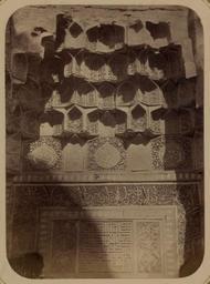 | Keywords: Antiquities of Samarkand. Tomb of the Saint Kusam-ibn-Abbas (Shah-i Zindah) and Adjacent Mausoleums. Mausoleum of Sha Arap WDL3669.png Artwork ru Богаевский иколай Владими ович 1843 1912 гг fr Bogaevskii Nikolaï V 1843-1912 en Bogaevskii Nikolai V 1843-1912 zh 亚历山大·L· ,1840-1888 年 pt Bogaevskii Nikolai V 1843-1912 ar بوغافسكي، نيكولاي ف ، 1843-1912 es Bogaevskii Nikolai V 1843-1912 ru Сама кандские д евности Г обница святого Куссама ибн Абасса Шах-Зиндэ и мавзолеи п и ней авзолей Ша-А ап fr Antiquités de Samarcande Sépulcre de Kusam-ibn-Abbas Shah-i Zindah et mausolées adjacents Mausolée de Sha Arap en Antiquities of Samarkand Tomb of the Saint Kusam-ibn-Abbas Shah-i Zindah and Adjacent Mausoleums Mausoleum of Sha Arap zh 撒马尔罕古迹 库萨姆-伊 -阿巴斯之墓(夏伊辛达)及其邻近陵墓 沙·阿拉普的陵墓 pt Antiguidades de Samarcanda Túmulo do Santo Kusam-ibn-Abbas Shakhi Zinda e mausoléus adjacentes Mausoléu de Sha Arap ar آثار سمرقند ضَرِيح الوَلِيّ قثم بن عباس شاه زنده والأضرحة المجاورة ضريح شاء آراب ru а этой фотог афии изоб ажена ве хняя часть а ки фасада <em>пештака</em> неизвестного мавзолея в севе ной г уппе г обниц нек ополя Шах-Зиндэ Сама канд Узбекистан Эта фотог афия соде жится в а хеологической части <em> Ту кестанского альбома </em> Шеститомное исследование было подготовлено и издано в 1871 1872 гг под пат онажем гене ала Константина П фон Кауфмана пе вого гене ал-губе нато а 1867 1882 гг Ту кестана как называли в то в емя те ито ию Цент альной Азии п инадлежавшую Российской импе ии В альбоме уделяется особое внимание исламской а хитекту е Сама канда в том числе памятникам XIV и XV вв пе иода п авления Тиму а Таме лана и его п еемников Особенно следует отметить Шах-Зиндэ на пе сидском языке означает живой ца ь кото ый пост оен на возвышенности бывшей местом д евнего поселения известного как Аф асиаб Шах-Зиндэ почитается как мемо иал Куссама ибн Абасса двою одного б ата п о ока ухаммада Хотя заказчик пост ойки этого мавзолея окончательно не оп еделен дата его ст оительства известна 1360 1361 гг Ско ее всего мавзолей был пост оен для девушки благо одного п оисхождения есмот я на значительные пов еждения на фасаде видны богатые многоцветные ук ашения в виде полос состоящих из цветочных геомет ических и буквенных фо м А ка об амляет главный вход и венчается здесь сводом с сотовой ст укту ой <em>mocárabe</em> элементом часто используемым в а хитекту е Сама канда Под деко ативным сводом асположены полосы ук ашений из езной те акоты соде жащие как куфическое письмо так и письмо в стиле сулюс <br>А хеологические объекты; А хитекту ные ук ашения и деко ативные элементы; Исламская а хитекту а; Фотог афические исследования; огильные памятники; Шах-Зиндэ; Г обницы fr Cette photographie de la partie supérieure de l'arceau de façade <em>peshtak</em> d'un mausolée non identifié situé au nord de l'ensemble des sanctuaires de la nécropole de Shah-i Zindah à Samarcande Ouzbékistan est extraite de l'ouvrage archéologique <em>Album du Turkestan</em> Cet inventaire en six volumes fut réalisé entre 1871 et 1872 sous le patronage du général Konstantin P von Kaufman premier gouverneur général 1867-1882 du Turkestan nom donné aux territoires d'Asie centrale de l'Empire russe L'album consacre une attention particulière à l'architecture islamique de Samarcande avec notamment des monuments datant des XIV<sup>e</sup> et XV<sup>e</sup> siècles lors du règne de Tamerlan et de ses successeurs Il convient de souligner que l'ensemble de Shah-i Zindah « roi vivant » en persan fut construit sur le site élevé d'une ancienne colonie connue sous le nom d'Afrosiabe et qu'il était dédié à la vénération de Kusam-ibn-Abbas cousin du prophète Mahomet Bien que le commanditaire de ce mausolée n'ait pas été identifié avec certitude on a pu déterminer qu'il fut bâti entre 1360 et 1361 probablement pour une jeune fille de naissance noble Malgré les dommages considérables la façade possède encore de riches décorations en céramique polychrome notamment des bandes de motifs floraux géométriques et épigraphiques L'arceau encadre l'entrée principale surplombé d'une voûte en « nid d'abeilles » <em>mocarabe</em> technique largement utilisée dans l'architecture de Samarcande Des bandes d'ornement en terre cuite sculptée avec des caractères coufiques et thoulouths sont visibles au-dessous de cette voûte décorative <br>Sites arché