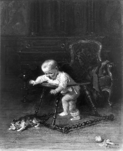 | Keywords: Antoine-Émile Plassan - Disappointment - Walters 3756.jpg A red-haired infant boy enclosed in a wheeled wooden walker angrily pursues a cat across the floor In the right foreground lies an apple and one of the child's stockings In the background appear a rococo-style armchair and a baroque-style cupboard rendered in light wood with contrasting panels of black ebony raised on baluster legs century 19 oil on panel mahogany cm 18 4 15 4 accession number 37 56 32970 William T Walters Baltimore prior to 1884 from the artist mode of acquisition unknown Henry Walters city Baltimore Walters Art Museum Henry Walters Acquired by William T Walters before 1884 Signature At lower right in block letters PLASSAN place of origin France Walters Art Museum license 2D Antoine Émile Plassan French paintings in the Walters Art Museum Media contributed by the Walters Art Museum needs category review |