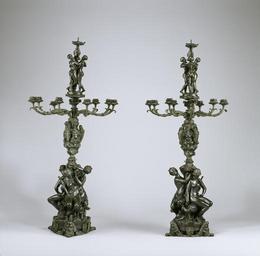 Keywords: Antoine-Louis Barye - Candelabra of Nine Lights, Candelabra with Nine Branches - Walters 27168, 27169 - Profile.jpg Barye produced decorative objects as well as figurative sculptures His revival of the Renaissance style is illustrated by this pair of candelabra which incorporates such classical motifs as the palmette-shaped ornaments known as anthemia flanked by mascarons masks on the bases The three seated nude figures are the goddesses who competed in the beauty contest that resulted in the Trojan War Minerva identified by her owl Juno and her peacock and Venus with her dolphin At the top the three Graces dance around a finial topped by a Roman lamp Originally Barye's Roger and Angelica Walters 27 173 and these candelabra formed a mantle ornament that was commissioned in about 1840 by the duke of Montpensier the youngest son of King Louis-Philippe The sculpture and the candelabra were subsequently cast in multiples and sold separately modeled ca 1840; posthumously cast post-1875 bronze cast in several sections with green over black patina cm 93 3 42 9 42 9 accession number 27 168 27 169 77392 Mme Barye William T Walters city Baltimore Henry Walters city Baltimore Walters Art Museum Henry Walters Acquired by William T Walters 1885 Signature Cast through from model on bases of female figural section BARYE place of origin Paris France Walters Art Museum license Sculptures by Antoine-Louis Barye Media contributed by the Walters Art Museum needs category review Collections of the Walters Art Museum Statues of the Three Graces Statues of Minerva |