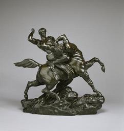 | Keywords: Antoine-Louis Barye - Lapith Combating a Centaur - Walters 2736 - Profile.jpg The hero Theseus has leapt on Bianor's back and seized him by the neck as he prepares to deliver a deadly blow Barye has depicted an incident from The Metamorphoses a history of the world by the Roman poet Ovid 43 BC-AD 17 In ancient Greece the Lapiths a mythical people of Thessaly invited to the centaurs to a wedding The centaurs were mythical creatures half man and half horse who roamed Arcadia a region of Greece and were notoriously destructive All the centaurs were killed following a fight that erupted when they tried to carry off the Lapith women modeled 1846-1848 bronze with dark green over dark brown-black patina cm 34 6 38 1 13 7 accession number 27 36 37364 William T Walters Baltimore prior to 1889 Henry Walters city Baltimore Walters Art Museum Henry Walters Acquired by William T Walters before 1889 Signature Cast through from model BARYE Exhibited at the Salon 1850 Musée du Louvre The Works of Antoine-Louis Barye American Art Gallery New York New York 1889-1890 Untamed The Art of Antoine-Louis Barye The Walters Art Museum Baltimore; Philbrook Museum of Art Tulsa; The Henry Morrison Flagler Museum Palm Beach 2007-2008 place of origin Paris France Walters Art Museum license Sculptures by Antoine-Louis Barye Media contributed by the Walters Art Museum needs category review Sculptures in the Walters Art Museum Salon of 1850 Battle of Lapiths and Centaurs Barye Theseus and the Centaur |