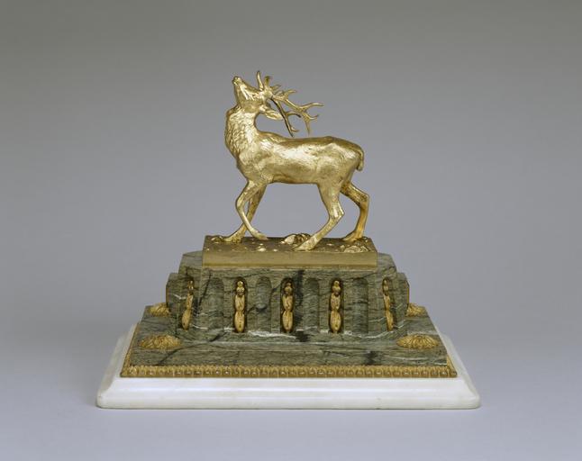 Keywords: Antoine-Louis Barye - Stag with Head Raised Upwards; Stag Feeding - Walters 2775 - Profile.jpg Barye modeled this statuette while employed by the goldsmith Jacques Henri Fauconnier 1779-1839 To conceal the fact that this piece and Walters 27 74 are of different metal alloys they have been gilded and mounted on similar though not identical late 18th-century-style marble bases modeled 1820s gilt brass on a green and white marble plinth with gilt bronze appliqués cm 17 5 22 9 14 3 accession number 27 75 30935 William T / Henry Walters Collection Baltimore date and mode of acquisition unknown Walters Art Museum Henry Walters Acquired by William T or Henry Walters Signature Cast through from model BARYE Untamed The Art of Antoine-Louis Barye place of origin Paris France Walters Art Museum license Sculptures by Antoine-Louis Barye Sculptures in the Walters Art Museum Statues of deer Metal statues of animals 1820s statues |
