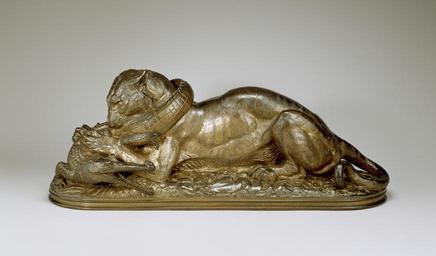 Keywords: Antoine-Louis Barye - Tiger Devouring a Gavial (First Reduction) - Walters 27154 - Profile.jpg When a plaster model for this sculpture appeared in the Paris Salon of 1831 critics were astonished by the choice of an animal theme over a more conventional human subject One critic praised the manner in which Barye expressed both the suffering of the gavial an Indian crocodile with a narrow snout and the grim determination of the tiger He also admired the sculptor's ability to portray a subject that he could never actually have witnessed This particular piece bears the stamp of A Victor Paillard 1805-1886 a Bourbon crown over the letters VP His foundry was noted for the quality of the casting There is a certain lack of clarity to the impression of the stamp which led experts to consider the possibility that the bronze was a surmoulage a cast after another cast but this opinion has now been rejected modeled ca 1831; cast ca 1845 sand cast bronze cm 20 51 3 18 4 accession number 27 154 40322 William T Walters Baltimore prior to 1889 mode of acquisition unknown Henry Walters city Baltimore Walters Art Museum 1931 by bequest Acquired by William T Walters before 1889 Signature Cast through from model BARYE; Stamp Under crown VP; Number Painted inside base in white W 20 The Works of Antoine-Louis Barye American Art Gallery New York New York 1889-1890 Untamed The Art of Antoine-Louis Barye The Walters Art Museum Baltimore; Philbrook Museum of Art Tulsa; The Henry Morrison Flagler Museum Palm Beach 2007-2008 place of origin Paris France Walters Art Museum license Tiger Devouring a Gavial by Antoine-Louis Barye Media contributed by the Walters Art Museum needs category review Sculptures in the Walters Art Museum |