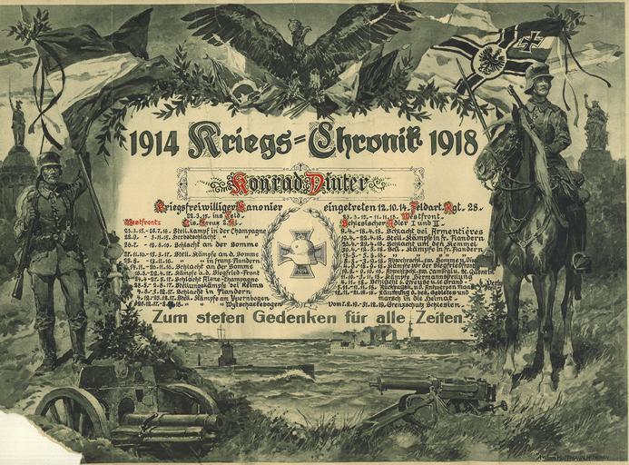 Keywords: Anton Hoffmann.Muenchen 1914 Kriegschronik 1918 zum steten Gedenken für alle Zeiten Vordruck handbeschriftet für Konrad Dinter Kriegsfreiwilliger Kanonier.jpg Vor- Druck einer illustrierten Umrahmung nach einer Zeichnung von Anton Hoffmann für einen individuell auszufüllenden Text als Erinnerungsblatt für überlebende Soldaten des Ersten Weltkriegs Zu sehen sind das links Hermannsdenkmal ein ausgerüsteter Soldat mit Gewehr und Fahne und ein bekränztes Grabmal Im unteren Bildteil ist eine Kanone zu sehen ein U-Boot und ein Schlachtschiff sowie ein Maschinengewehr ganz unten rechts die Künstlersignatur žAnton Hoffmann Muenchen Am rechten Bildrand begrenzt ein berittener Soldat das Geschehen unter der Reichsfahne und einem Luftschiff rechts darunter die Germania Niederwalddenkmal à ber allem tront zentral der bekrönte Reichsadler Zwischen der darunter vorgedruckten à berschrift 1014 Kriegs-Chronik 1918 und dem Untertitel Zum steten Gedenken für alle Zeiten war Raum für eine individuelle Kriegschronik der einzelnen Soldaten Die hier vorliegende Chronik wurde für Konrad Dinter aufgezeichnet žKriegsfreiwilliger Kanonier eingetreten am 12 Oktober 1914 in das Feldartillerie-Regiment 28 Gut fünf Monate nach dem Eintritt ins Soldatenleben ging es am 23 März 1915 hinaus žins Feld an die Westfront wofür Konrad Dinter ausweislich der Handschrift mit dem Eisernen Kreuz Zweiter Klasse ausgezeichnet wurde Laut der Kriegs-Chronik wurde Konrad Dinter - offensichtlich in einem Freikorps - jedoch noch in der Weimarer Republik für den žGrenzschutz Schlesien im Jahr 1919 mit dem Schlesischen Adler I und II ausgezeichnet Nach der Chronik kämpfte der Kanonier wie folgt an der Westfront 23 März 1915 bis 25 Juli 1916 im Stellungskampf in der Champagne der 1915 an der Herbstschlacht gipfelte und 1916 in der Schlacht an der Somme Nach Stellungskämpfen in Französisch-Flandern an der Somme und einer weiteren Schlacht an der Somme kämpfte Konrad Dinter an der Siegfried-Front und in der Schlacht Aisne-Champagne gefolgt von den Stellungskämpfen bei Reims der Schlacht in Flandern sowie den Stellungskämpfen am Ypernbogen und den von Ende 1917 knapp ein Jahr andauernden Stellungskämpfen am Wytschaetebogen Diese Kämpfe werden rechts von dem zentral vorgedruckten Eisernen Kreuz mit Helm im Loorbeerkranz wie folgt aufgezählt Schlacht bei Armentières Stellungskämpfe in französisch-Flandern Schlacht um den Kemmel gefolgt von offensichtlich verschiedenen Stellungskämpfen der aus deutscher Sicht Abwehrschlacht zwischen Somme und Oise wieder die Siegfriedfront dann die Abwehrschlacht zwischen Cambrai und St Quentin die Kämpfe in der Hermannstellung die Schlacht bei Etreuse und le Grand-Verly schließlich die Rückzugskämpfe vor der Antwerpen-Maas-Stellung sowie die Räumung des besetzten Gebietes und bis wenige Tage vor Weihnachten 1918 der žMarsch in die Heimat Nach dem Ersten Weltkrieg žarbeitete Konrad Dinter vom 7 Februar bis 31 Dezember 1919 im žGrenzschutz Schlesien Maße des zerknickten ein- und teils unvollständigen abgerissenen Blattes circa 50 cm x 40 cm; Maße des Vor- Druckes circa 40 cm x 29 cm; rückseitig blanco Scan vom Original Bernd Schwabe in Hannover Anton Hoffmann 1938 ~ 1919 Kanonier Anton Hoffmann Painter Military volunteers World War I forces of Germany in Belgium World War I forces of Germany in France World War I in art PD-old-70 |