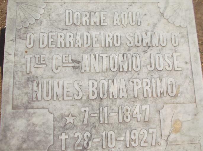 | Keywords: Antonio José Nunes Bona Primo de CM.JPG Imagem da lápide do túmulo de Antonio José Nunes Bona Primo Um político militar e fazendeiro que denomina a Prça Bona Primo em Campo Maior-Piauí trabalho próprio own work 2014 seu nome ou assinatura Academia de letras de CM <span class signature-talk ></span> Campo Maior Piauí |