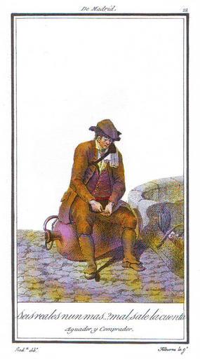 | Keywords: Antonio Rodríguez - Aguador - Madrid.JPG es Grabado Seis reales nada más Mal sale la cuenta 1802 en el catálogo de 'Trajes de España' dibujado por Antonio Rodríguez Reproducción facsimil de treinta y ocho estampas más catorce variantes de los Trajes de Madrid Todas iluminadas Introducción de Juan Carrete Parrondo Madrid 1989 Coleccion General de los Trajes de Madrid 52 grabados de Antonio Rodríguez Madrid 1801 Facsimil 1989 Edición del Exmo Ayuntamiento de Madrid ISBN 84-7812-069-6 escaneado por el usuario que sube la imagen al repertorio de los Comunes Drawn by Creator Antonio Rodríguez Valencia 1765 - Madrid ca 1825 ; 1801 Unclear-PD-US-old-100 Madrid in the 1800s People of Madrid in art 1801 engravings Engravings from Spain Water sellers from Spain Water sellers in art Cántaros in art Coleccion general de los trajes de Madrid |