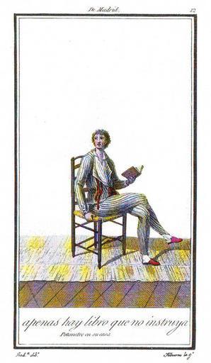 | Keywords: Antonio Rodríguez - Petimetre.JPG es Grabado apenas hay libro que no instruya Petimetre en su casa 1802 en el catálogo de 'Trajes de España' dibujado por Antonio Rodríguez Reproducción facsimil de treinta y ocho estampas más catorce variantes de los Trajes de Madrid Todas iluminadas Introducción de Juan Carrete Parrondo Madrid 1989 Coleccion General de los Trajes de Madrid 52 grabados de Antonio Rodríguez Madrid 1801 Facsimil 1989 Edición del Exmo Ayuntamiento de Madrid ISBN 84-7812-069-6 escaneado por el usuario que sube la imagen al repertorio de los Comunes Drawn by Creator Antonio Rodríguez Valencia 1765 - Madrid ca 1825 ; 1801 Unclear-PD-US-old-100 Madrid in the 1800s People of Madrid in art 1801 engravings Engravings from Spain Coleccion general de los trajes de Madrid |